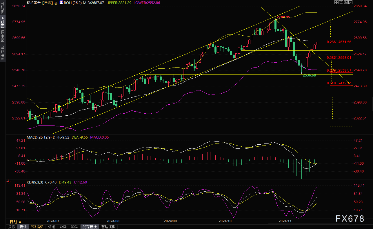 4小时级别:单边上涨,若能顶破2790-2536跌势的61.8%回撤位2693.36阻力,则有望重新涨向历史高点2790附近,短线的话2700关口和2710附近也还分别存在一些阻力,尤其是2710关口,是前期下跌行情的跌破口,若能收复该位置,也会增加后市看涨信号,若不能顶破该位置,则仍需提防行情转跌的可能性。另外,目前KDJ发出顶背离和超买信号,MACD轻微顶背离,如果金价持续承压于2693.36阻力,则需要提防金价重回跌势的风险。