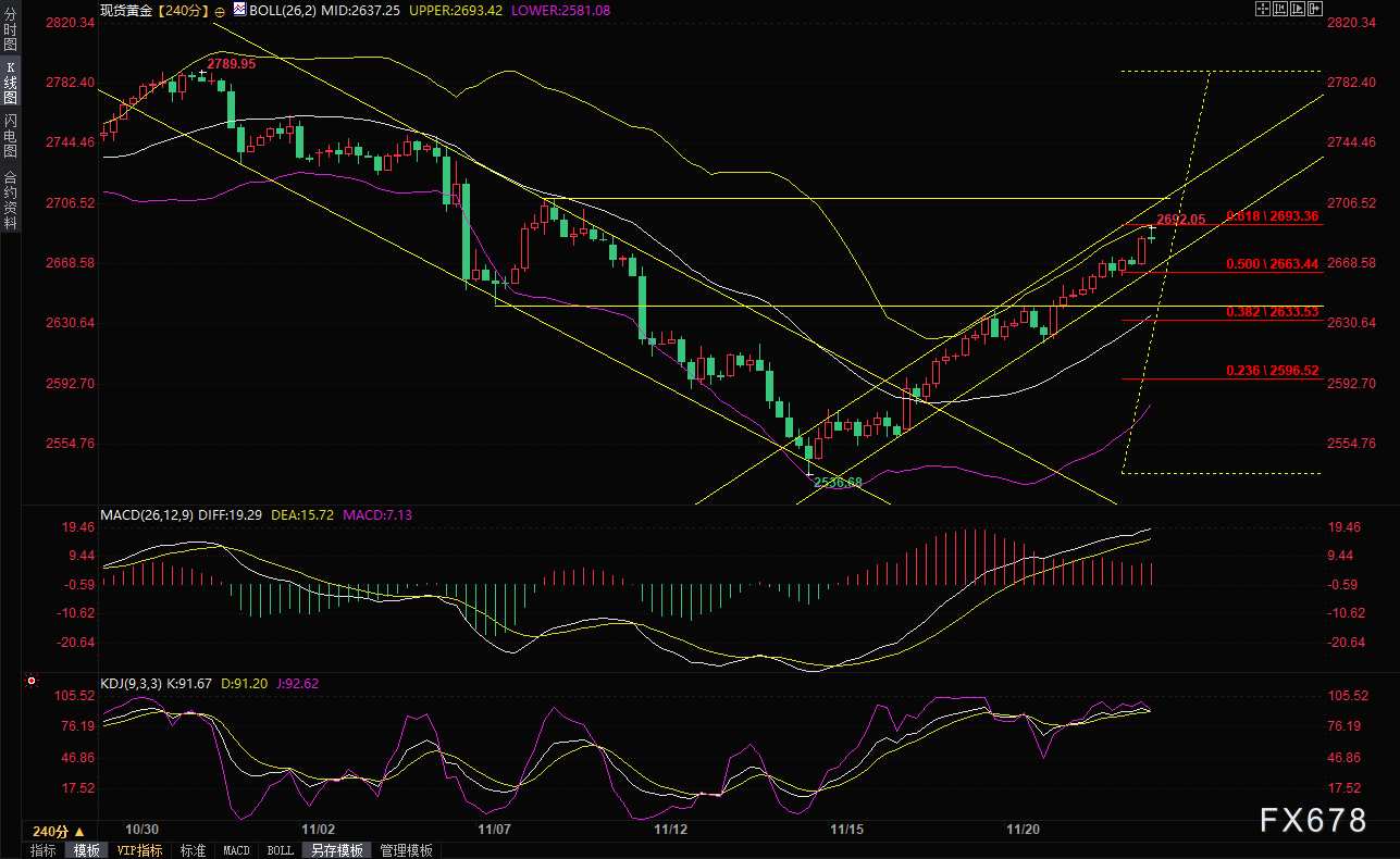 周五(11月22日)亚洲时段,现货黄金震荡走高,一度刷新近两周高点至2692.06美元/盎司,俄乌地缘局势紧张,继续给金价提供上涨动能,技术面信号也偏向多头,短线金价有望上探2700-2710区域阻力。