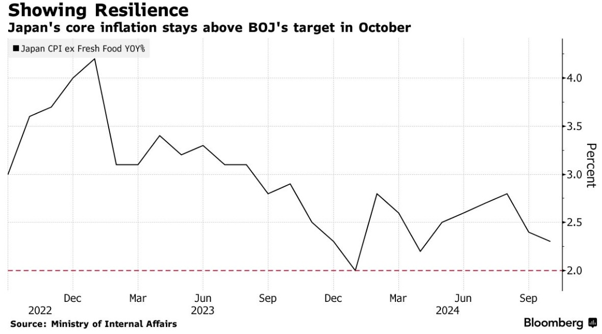 日本政府周五报告称,10 月份不包括新鲜食品的消费者价格同比上涨 2.3%,低于 9 月份的 2.4%。这一涨幅高于市场普遍预期的 2.2%。不包括能源成本和新鲜食品价格的指数上涨 2.3%,高于 9 月份的 2.1%。