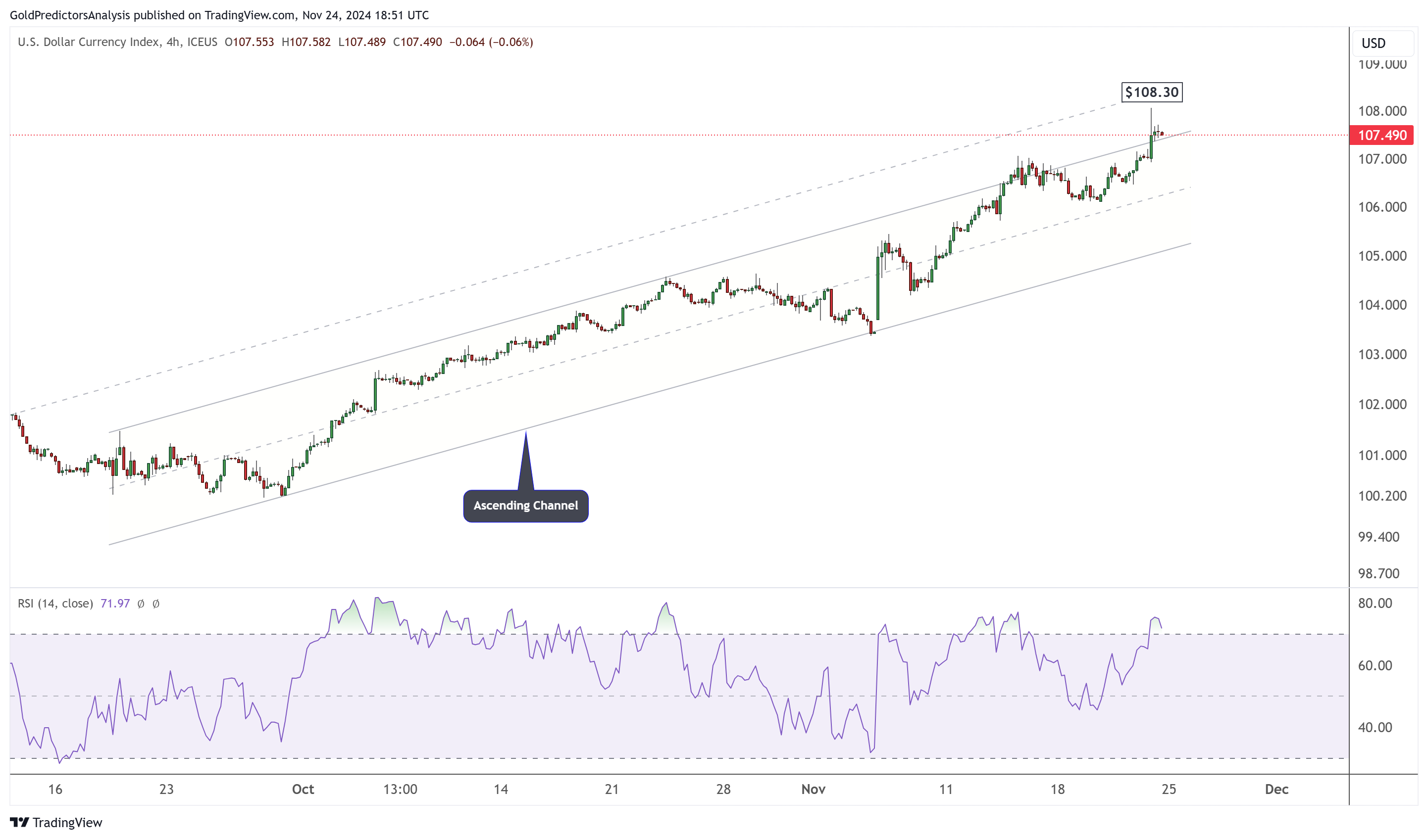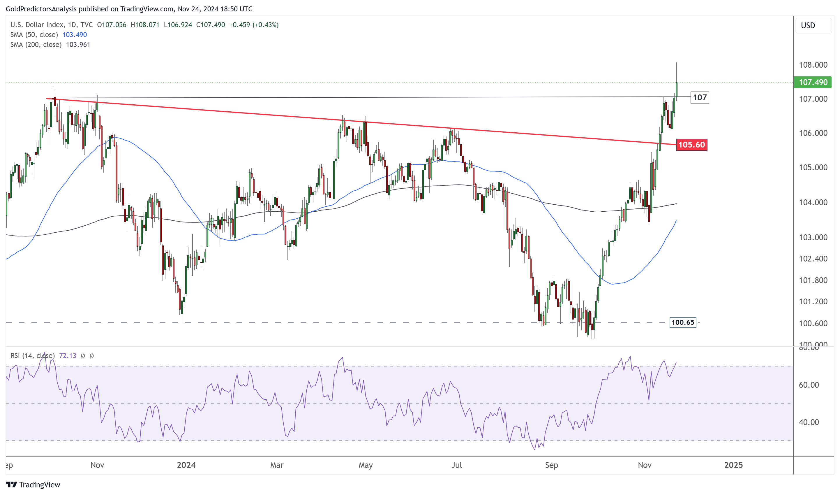 回到市场,美元上周五走强,试图突破107的关键水平。这一积极的价格走势是在美国经济数据强劲、服务业PMI超出预期之后形成的。然而,尽管制造业PMI略有改善,但仍处于收缩区间,因此出现了喜忧参半的信号。与此同时,消费者信心有所改善,表明对经济复苏持谨慎乐观态度。尽管美元上涨,但交易员降低了美联储 12月降息的可能性。这反映出通胀趋势和货币政策方向的不确定性持续存在。