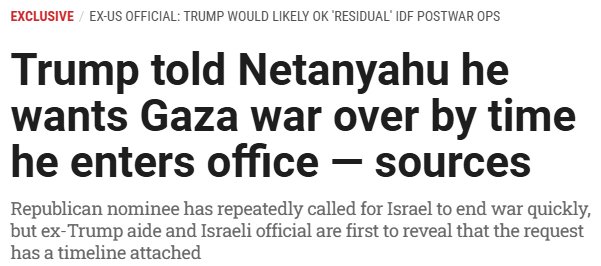在10月末,两位知情人士向《以色列时报》(TOI)透露,特朗普告诉内塔尼亚胡,他赢得大选后,希望以色列在他重返总统职位时结束加沙战争。据一位前特朗普政府官员和一位以色列官员透露,这一信息首次是特朗普7月在佛罗里达海湖庄园接待以色列总理时传达的。