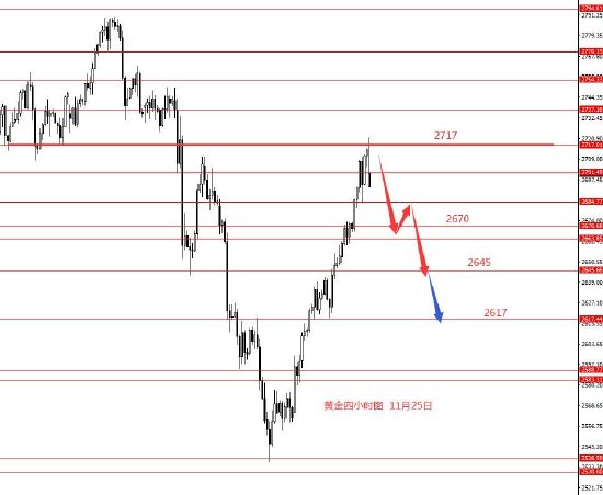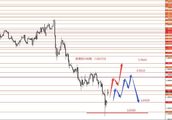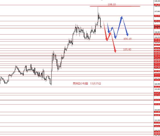 11月25日,美指上周正如预期冲高至108.10附近周图收中阳柱。从图形来看,本月美指的涨幅已到头,本周美指在高位震荡或小幅震荡下行的概率较大些,上方关注108.20,下方先关注106.10,若下破再关注105.70和105.40.今日早盘已直接回调,目前没好的操作建议可以给大家,只有框架思路,仅做参考吧。