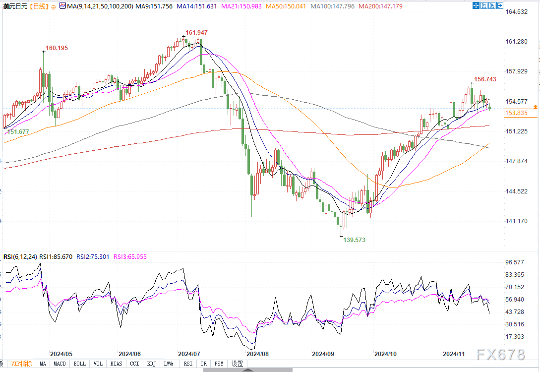 美元兑日元日线图北京时间11月25日11:42,美元兑日元报153.84/85