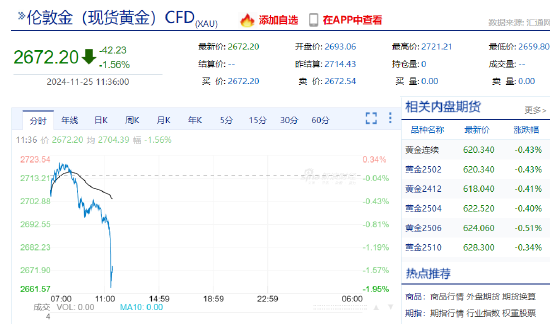 11月25日,现货黄金短线一度暴跌35美元,现报2672.20美元/盎司。