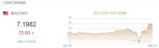 11月27日,人民币兑美元中间价报7.1982,下调72点。