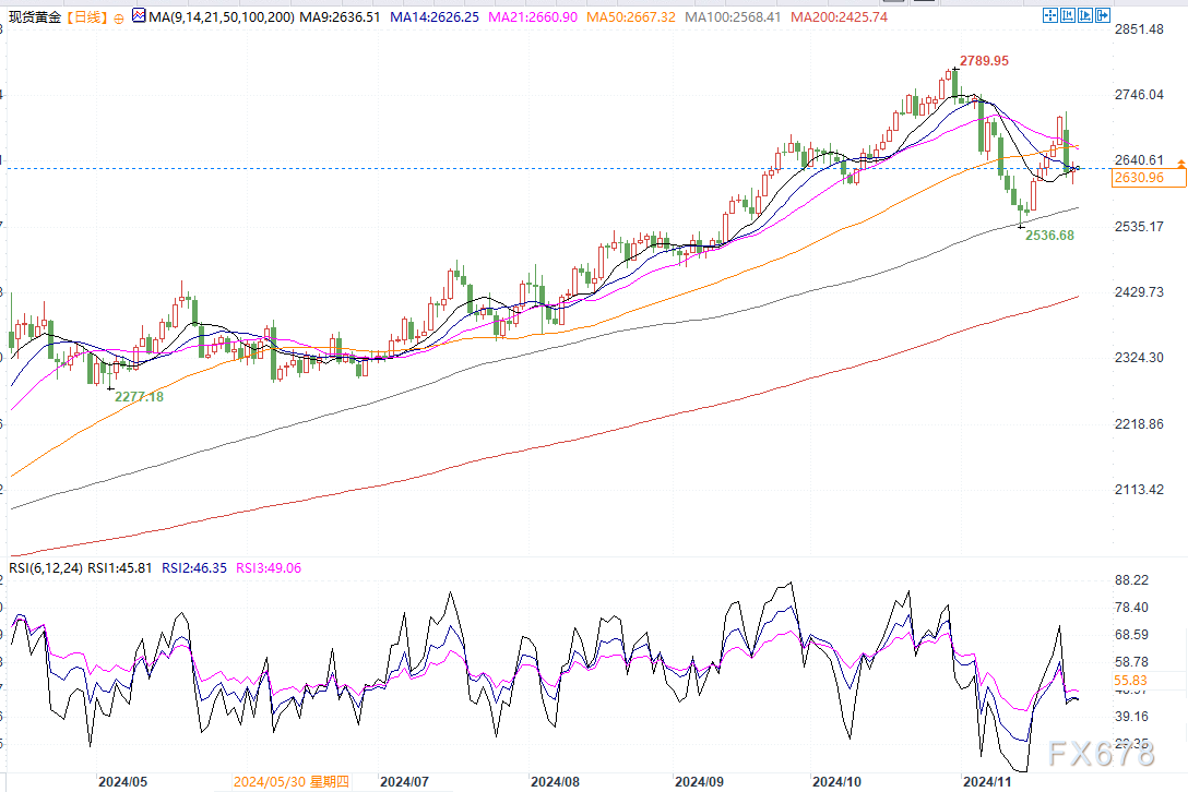 现货黄金日线图北京时间11月27日9:43,现货黄金报2630.49美元/盎司