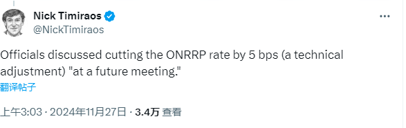 对此,“新美联储通讯社”Nick Timiraos在社交媒体上发文表示,在11月会议上,美联储官员讨论了在未来的某次会议上将隔夜逆回购利率下调5个基点。