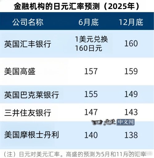 日本国内外的金融机构相继公布了2025年日元汇率走势预测。英国汇丰银行预计,到2025年6月末,1美元将兑换160日元,认为日元贬值(美元升值)态势将会进一步加剧,而美国摩根士丹利的预测是,1美元将兑换140日元,认为日元将缓慢升值。关于下一届特朗普政府的政策以及货币政策中的哪一个会对日元汇率产生更大影响,看法不同,预测的汇率水平也不一样。