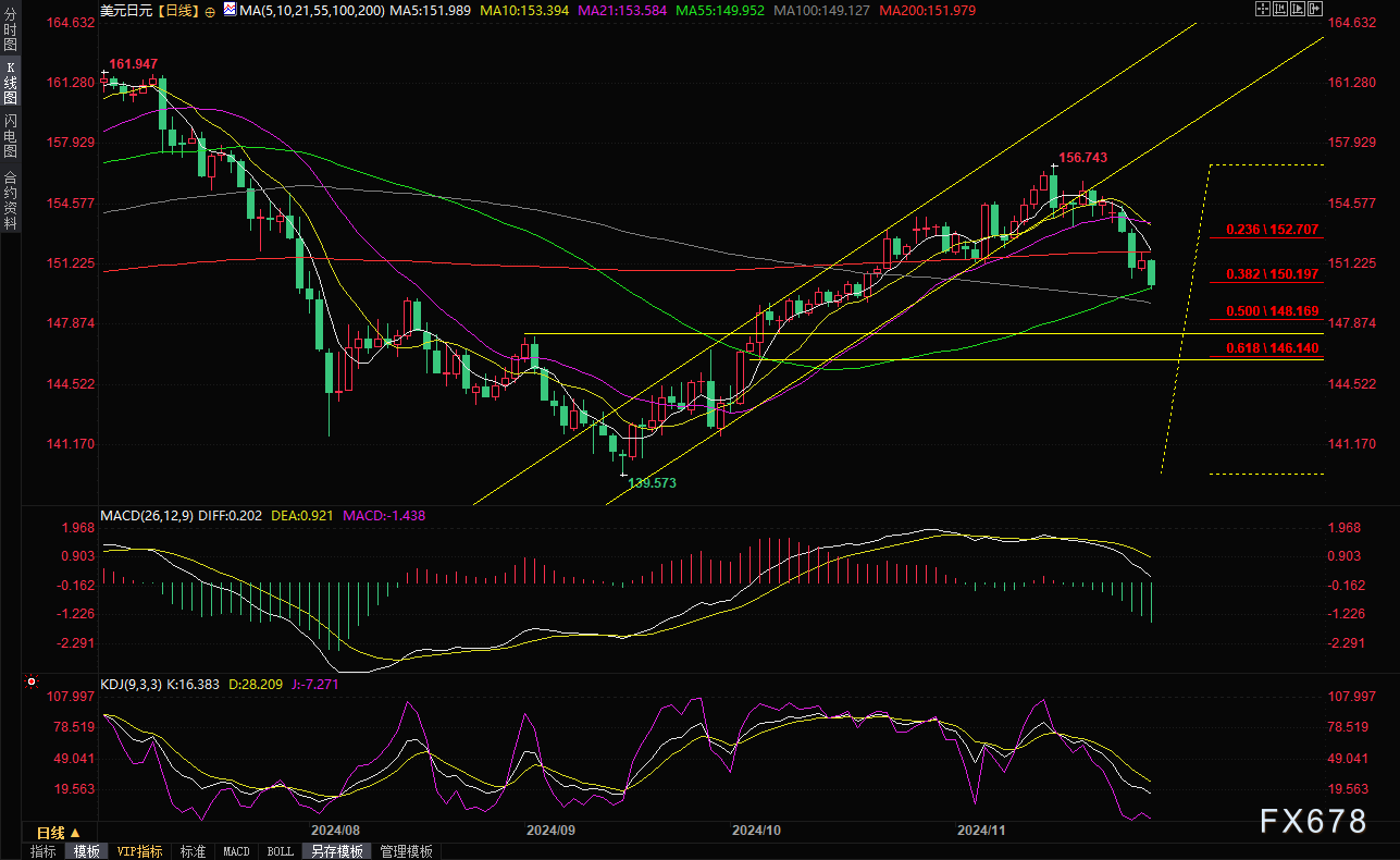 上方阻力11月27日低点在150.47;200日均线和5日均阻力在152.00附近。如果意外强势回升至该位置上方,则削弱后市看空信号。