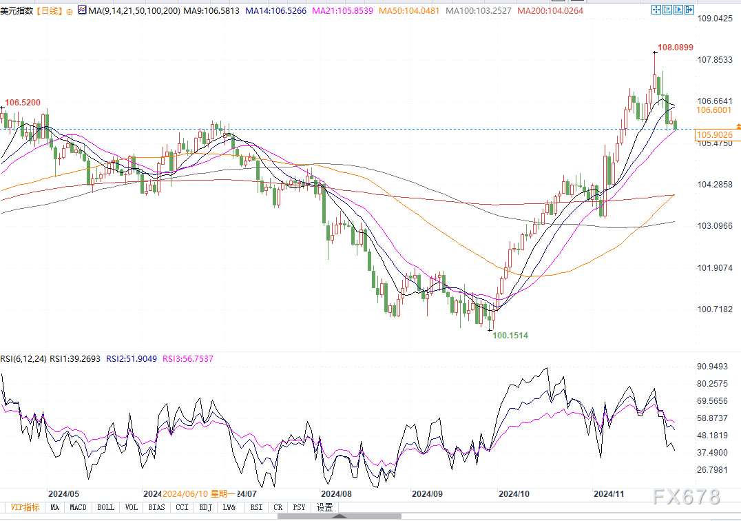 美元指数日线图北京时间11月29日9:33,美元指数报105.92
