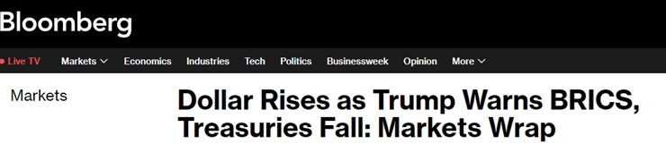 在特朗普表示他将要求金砖国家承诺不会采取行动创造新货币并威胁要征收100%的关税后,美元兑所有主要货币都攀升。