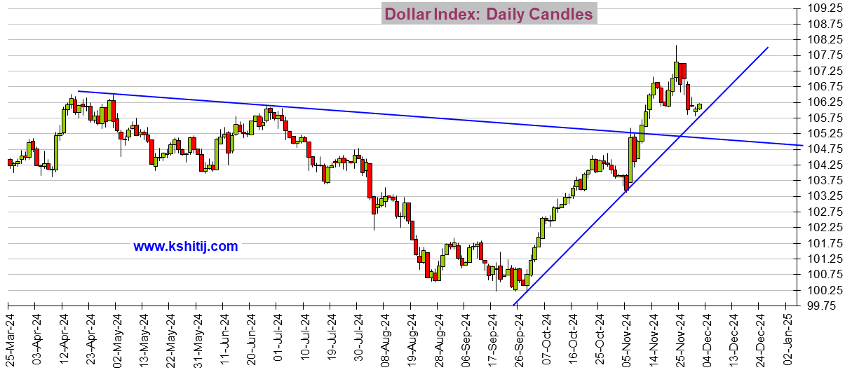 FX168财经报社(亚太)讯 周一(12月2日)亚市盘中,美元指数目前位于106.30附近,日内大涨逾50点。现货黄金维持日内大跌走势,金价目前位于2627美元/盎司附近。Kshitij咨询服务团队(Kshitij Consultancy Service)周一最新撰文,对美元指数、欧元/美元、欧元/日元、美元/日元、澳元/美元、英镑/美元、美元/人民币以及黄金后市走势进行前瞻分析。