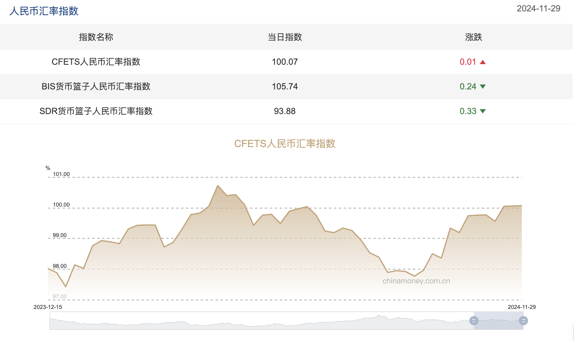 新华财经上海12月2日电(葛佳明) 中国外汇交易中心公布数据显示,11月29日当周三大人民币汇率指数多数下跌,CFETS人民币汇率指数报100.07,按周涨0.01,创2024年5月以来新高;BIS货币篮子人民币汇率指数报105.74,按周跌0.24;SDR货币篮子人民币汇率指数报93.88,按周跌0.33。