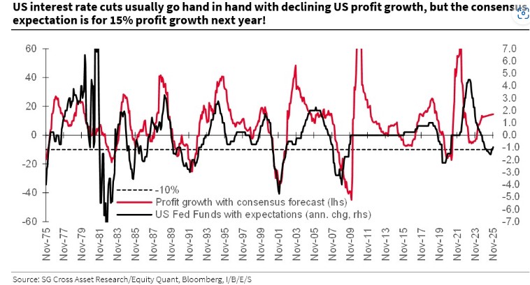 在11月30日的报告中,拉普索恩详细阐述了这一观点。他提到,从历史数据来看,当美国利率按照市场预期下调时,企业利润往往会下降10%。然而,当前市场却普遍预期明年每股收益将增长15%,这与历史趋势形成了鲜明对比。
