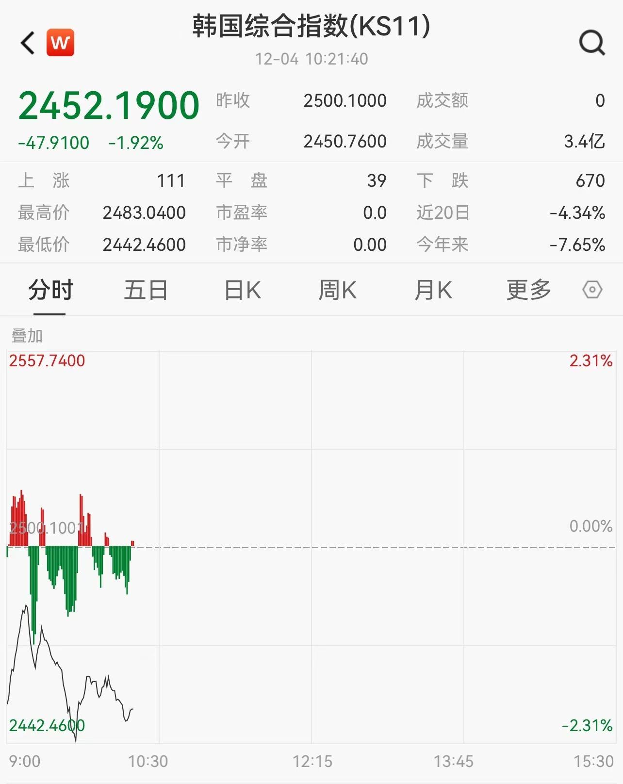 北京时间12月4日9时41分,韩国综合指数下跌近2%,韩元兑美元汇率跌幅收窄至0.7%。