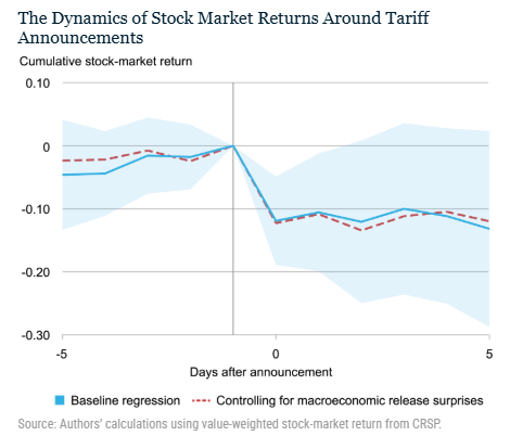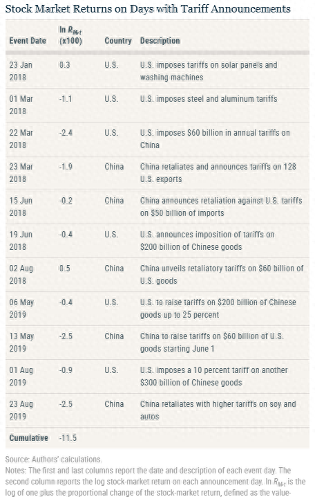 在对金融市场的影响方面,纽约联储的研究发现,加征关税的公告对股票市场估值产生了巨大影响。纽约联储工作人员通过研究美国和中国宣布的每一轮关税,在媒体上最早公布日期当天的市场走势来纪录了这种影响。