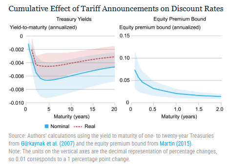 研究人员还表示,股市价格下跌可能反映出两种力量。首先,市场可能对未来公司利润变得更加悲观;其次,即使未来利润的预期路径保持不变,市场参与者持有风险资产的意愿也可能降低。研究发现,这些关税公告确实刺激了投资者逃向避险资产,使美债收益率下降(五年期美债影响最大),股权溢价(股票收益率与无风险资产收益率之差)上升。