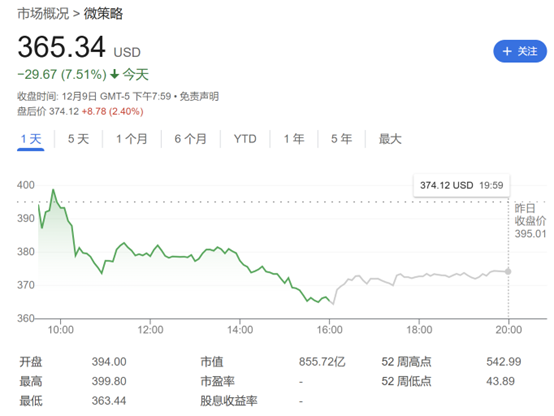 得益于比特币价格上涨,MicroStrategy今年以来股价飙升了逾430%,刺激了投资者对该股的需求。该股也是今年波动最大的美股之一。MicroStrategy周一下跌7.5%,至365.34美元。
