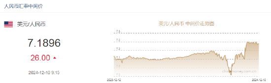 12月10日,人民币兑美元中间价报7.1896,下调26点。