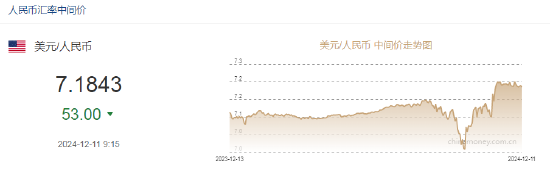 12月11日,人民币兑美元中间价报7.1843,上调53点。