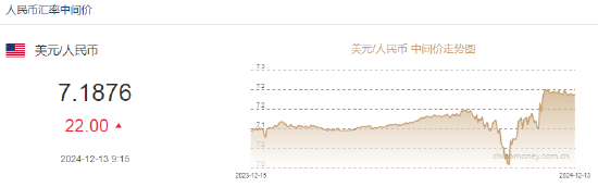 12月13日,人民币兑美元中间价报7.1876,下调22点。