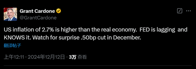 这位企业家和房地产大亨在推特上写道:“美国2.7%的通胀率高于实体经济。美联储落后了,并且知道这一点。小心它12月出人意料地降息50个基点。”