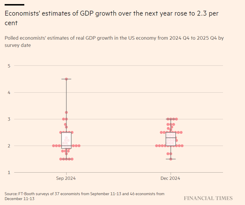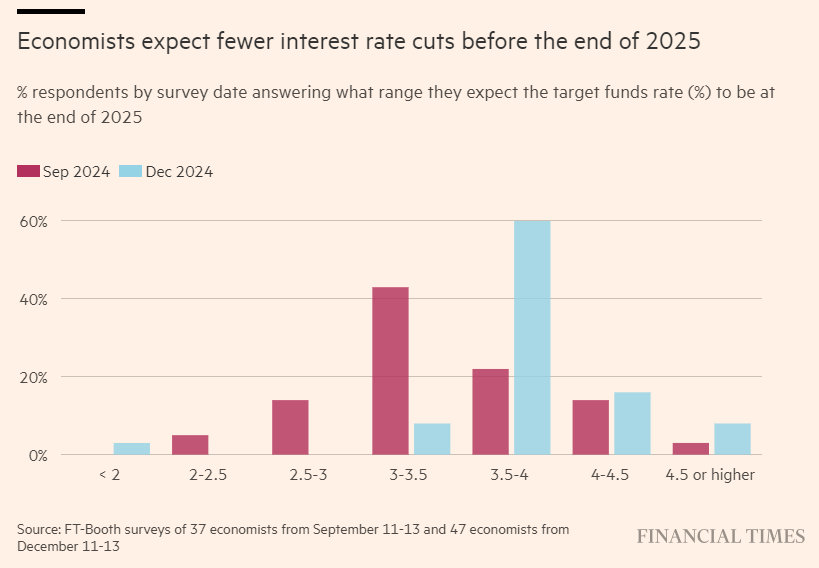 与9月份《金融时报》与芝加哥大学布斯商学院合作进行的调查相比,在12月11日至13日期间接受调查的经济学家上调了对明年联邦基金利率的预测。绝大多数受访者认为,到2025年底,利率将徘徊在3.5%或更高,而大多数受访者在9月份表示,届时利率可能会降至3.5%以下。