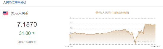 12月23日,人民币兑美元中间价报7.1870,上调31点。