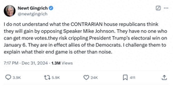 “我不明白,持反对意见的众议院共和党人认为反对议长迈克·约翰逊能得到什么好处。” 金里奇写道。他表示,“他们(反对约翰逊的人)没有人能得到更多支持票,他们可能会破坏特朗普总统的选举胜利。他们实际上是民主党人的盟友。”