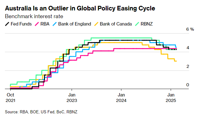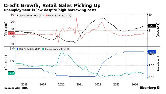 Bloomberg Economics经济学家James McIntyre表示:“市场定价并未反映出维持利率不变的风险这种可能性依然存在。为何存在不确定性?强劲的劳动力市场、有韧性的消费者、稳健的信贷增长以及疲软的货币,这些因素可能会促使澳洲联储推迟其政策转向。”
