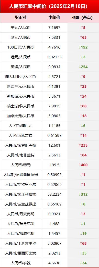 2025年2月18日,中国人民银行授权中国外汇交易中心公布银行间外汇市场人民币汇率中间价。具体如下: