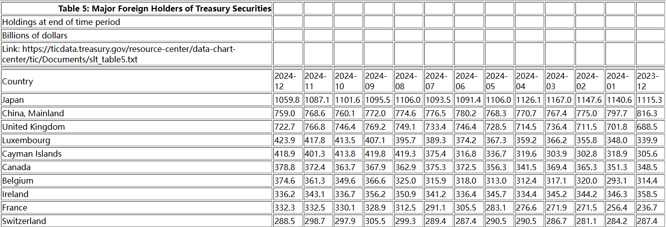 整体来看,12月份外国投资者持有的美国国债规模,从11月份的8.633万亿美元减少至了8.513万亿美元,创下了5个月来的新低。