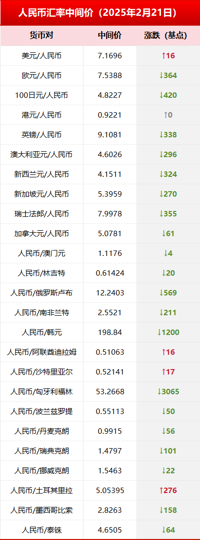 2025年2月21日,中国人民银行授权中国外汇交易中心公布银行间外汇市场人民币汇率中间价。具体如下:
