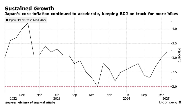 由于食品价格上涨,日本通胀超预期加速,达到自2023年夏季以来的最快增速,这使得日本央行有望进一步上调基准利率。