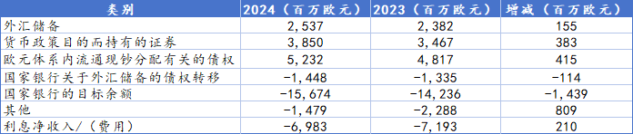欧洲央行2024年利息收入和支出如下: