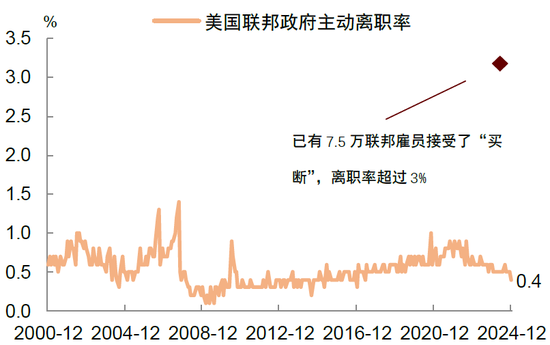 过去一个月,由马斯克领导的政府效率部门(DOGE)在削减财政开支方面进展迅速。首先,马斯克推出了针对联邦雇员的“买断计划”,有效推动了政府裁员[9]。根据“买断计划”,在规定时间前主动离职的联邦政府雇员可以享受 8 个月的薪资补偿,当事人的薪酬与福利持续至 9 月 30 日,并提供工作安排上的减免[10]。数据显示[11],到目前为止约有7.5万名联邦雇员接受了买断计划,占整个联邦雇员的比例超过3%,而3%的买断率也远远超过了常态时期美国联邦政府雇员0.4%的主动离职率(图表5)。根据DOGE的计划,最终的联邦政府裁员比例或在5%-10%左右,这意味着最终或有10-20万联邦雇员被迫换工作。