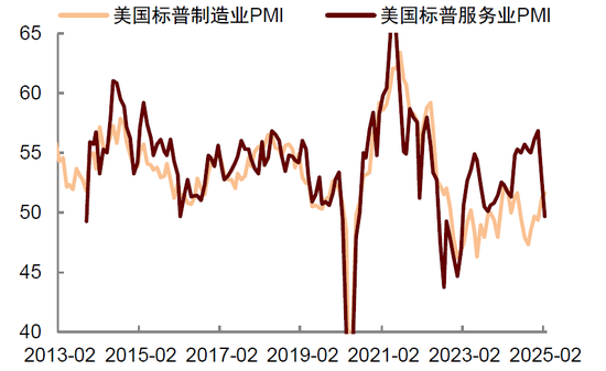 过去一周美国经济数据表现不佳:2月份NAHB房产市场指数超预期下跌,创去年9月以来最低值(图表1)。2月密歇根大学消费者信心指数终值连续第三个月下跌,创2023年11月以来新低(图表2)。2月标普服务业PMI初值49.7,为25个月以来首次跌破荣枯线(图表3)。这些变化表明,之前企业和消费者在特朗普胜选后积累的乐观情绪在消散。我们认为背后的原因来自三个方面:关税的不确定性,政府支出削减的紧缩效应,以及持续的高利率环境。