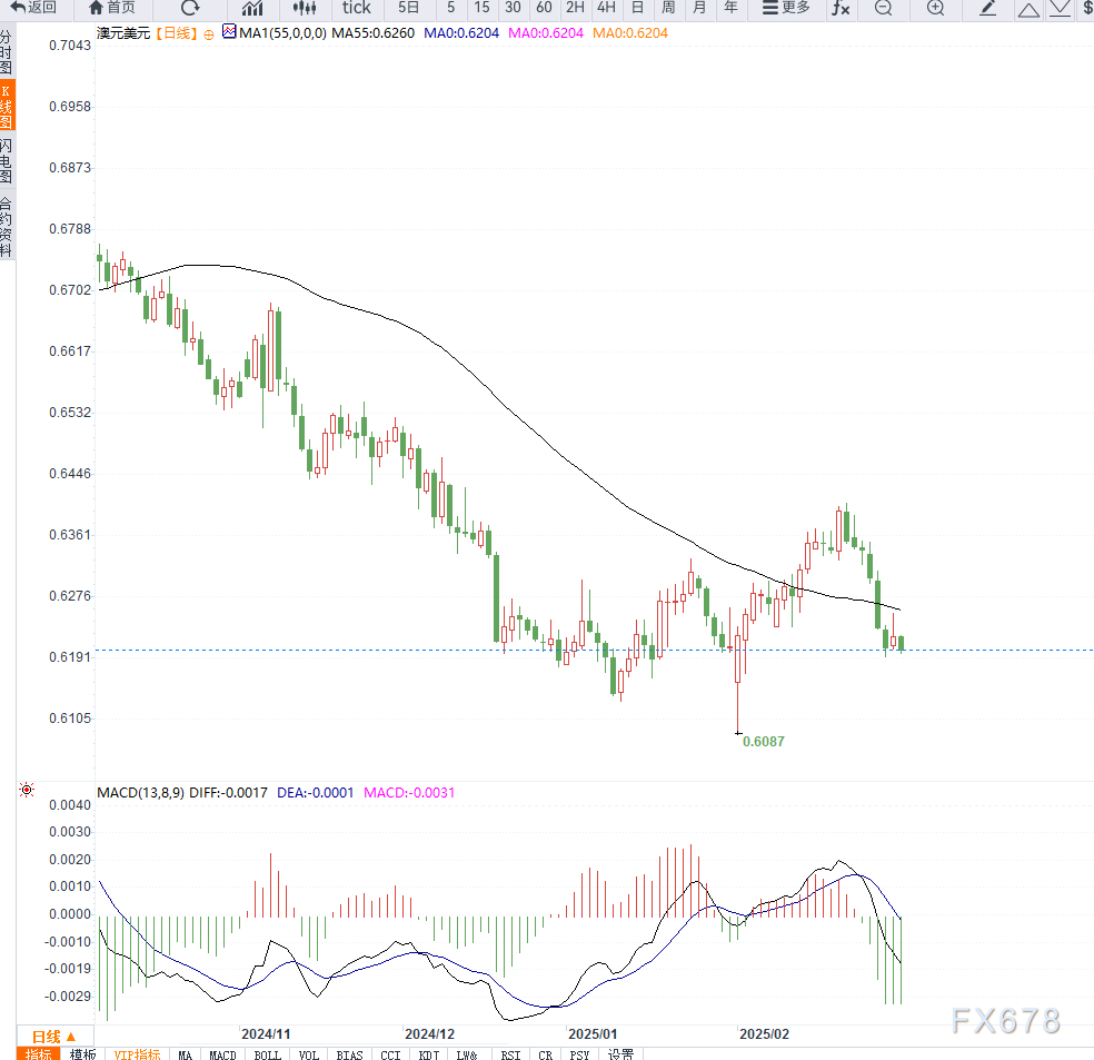 美元走强加剧澳元压力,市场聚焦美联储政策澳元近期走弱,主要受到美元走强的影响。 全球经济增长放缓的忧虑,以及美联储尚未释放明确降息信号,使得市场避险情绪升温,推动美元指数走高,进一步加大澳元的下行压力。
