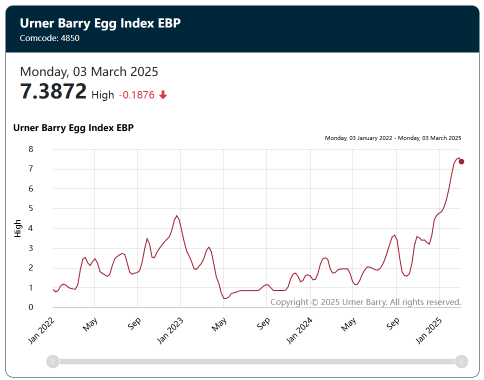 截至3月3日,市场研究公司Urner Barry的监测显示,用于跟踪和分析鸡蛋批发价格的指标Urner Barry Egg Index已经达到了每打(12枚)鸡蛋7.38美元的高价。