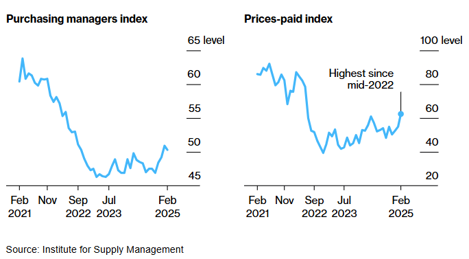 由于订单和就业的萎缩,美国工厂活动在上个月几乎陷入停滞。与此同时,受关税担忧的加剧影响,材料价格指数飙升至2022年6月以来的最高水平。根据周一公布的数据,美国供应管理协会(ISM)2月份制造业指数下降0.6点至50.3。指数高于50表明制造业处于增长状态。该组织的价格指标上升7.5点至62.4。