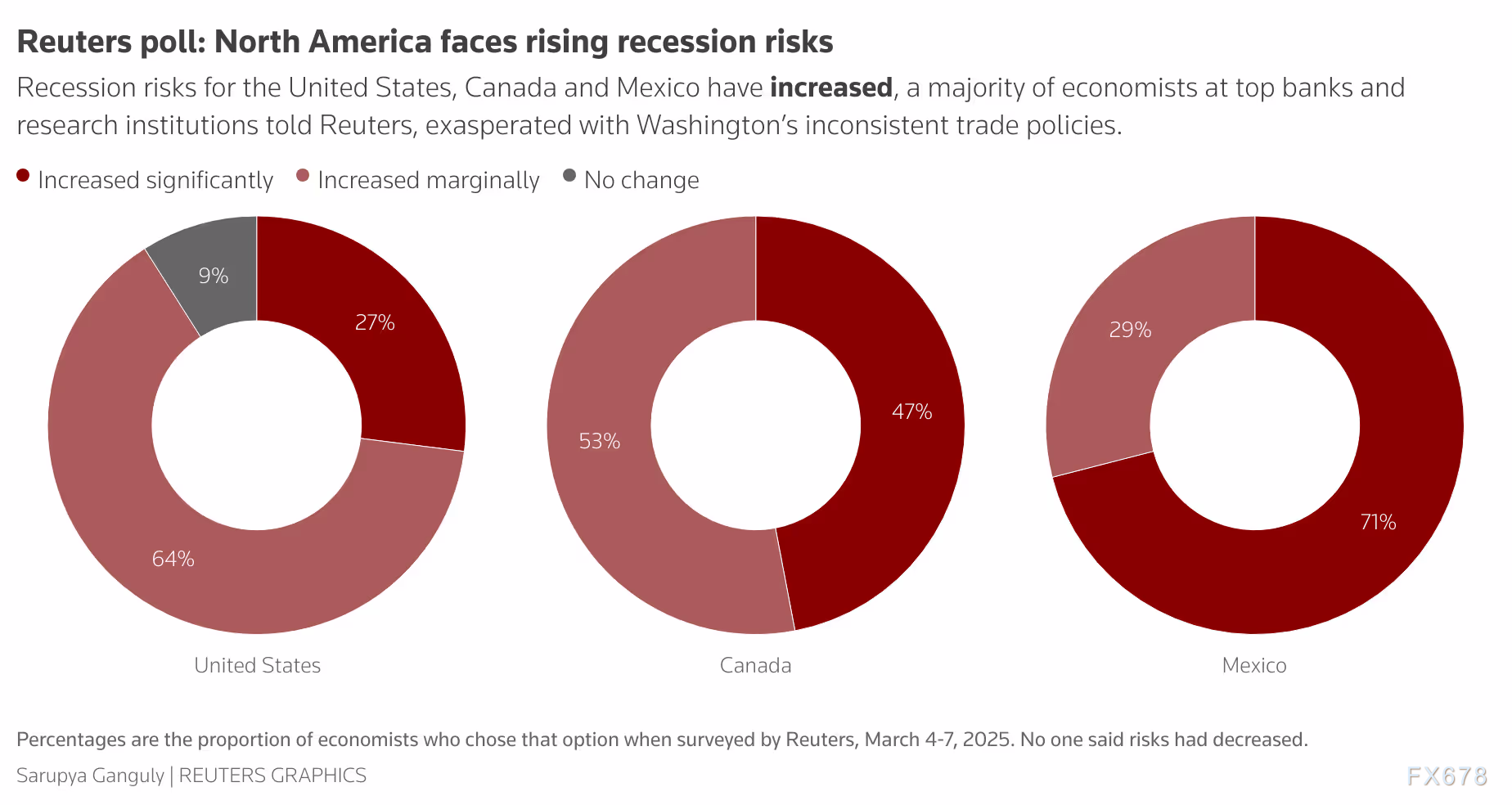 路透最新调查显示,美国关税政策的反复无常给北美三大经济体美国、加拿大和墨西哥带来了严重的不确定性,导致经济衰退风险显著上升。经济学家普遍认为,特朗普政府在贸易政策上的频繁变动使得预测经济增长、通胀和利率变得极为困难,甚至影响了加拿大央行的利率决策。与此同时,美国的通胀风险也在加剧,进一步加剧了经济前景的不确定性。