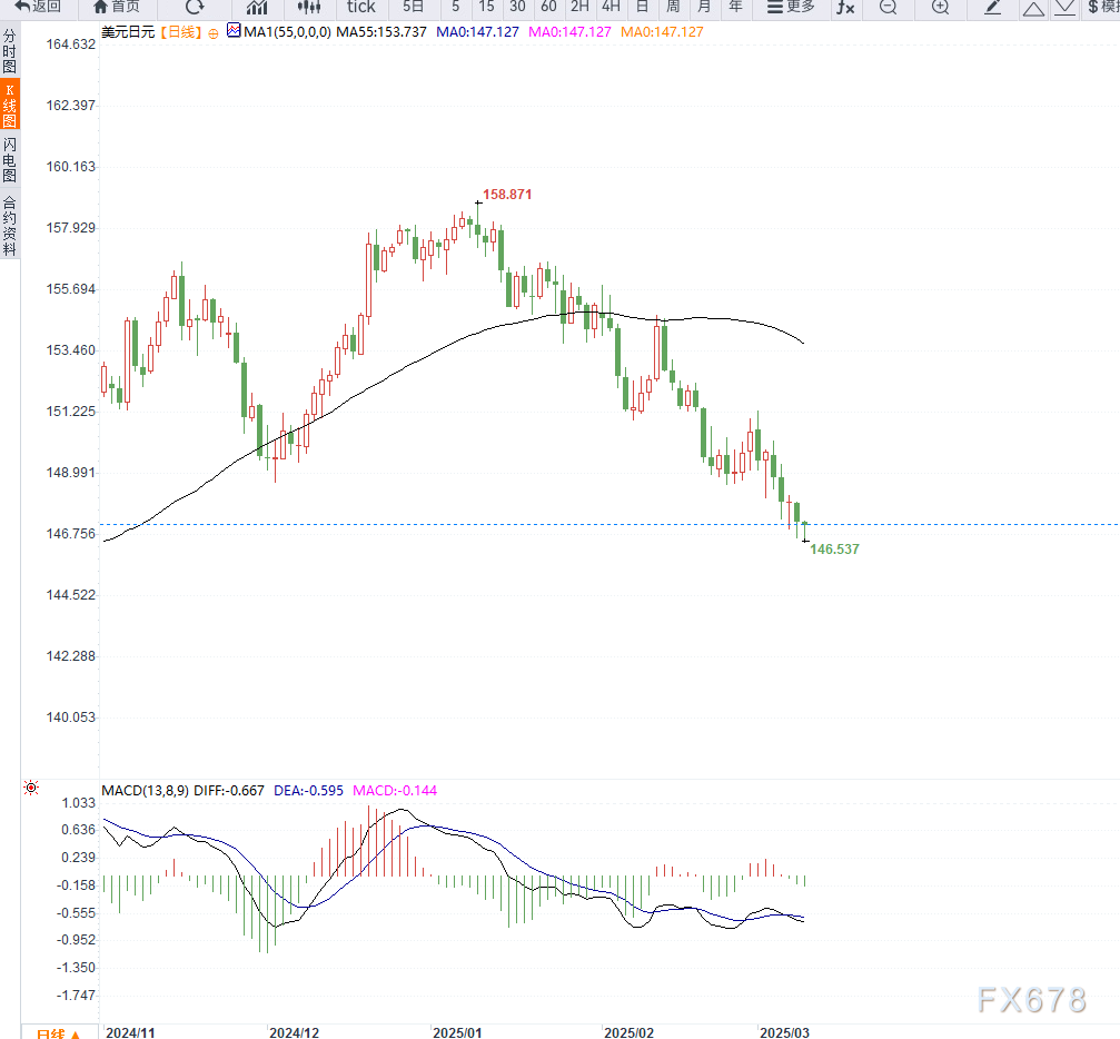在GDP数据公布后,日元兑美元一度跌破147关口,随后在全球市场波动中震荡整理。市场对日本经济前景的担忧,加上美债收益率上升,导致日元短线走软。