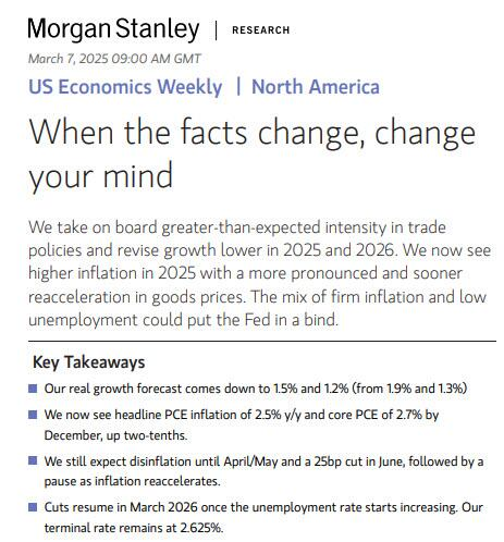 上周五,摩根士丹利首席美国经济学家Michael Gapen在给客户的报告中也将2025年美国GDP的增长预期从1.9%下调至1.5%,同时预计核心PCE物价指数将在2025年底达到2.7%,高于此前的2.5%预期。