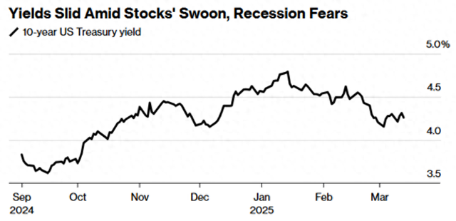 受此消息影响,华尔街对美国经济增长的担忧打压股市,并纷纷买入美国国债。美债收益率全线走低,2年期美债收益率跌2.95个基点报3.955%,3年期美债收益率跌3.36个基点报3.9475%,5年期美债收益率跌3.33个基点报4.0295%,10年期美债收益率跌3.65个基点报4.2701%,30年期美债收益率跌3.96个基点报4.5881%。