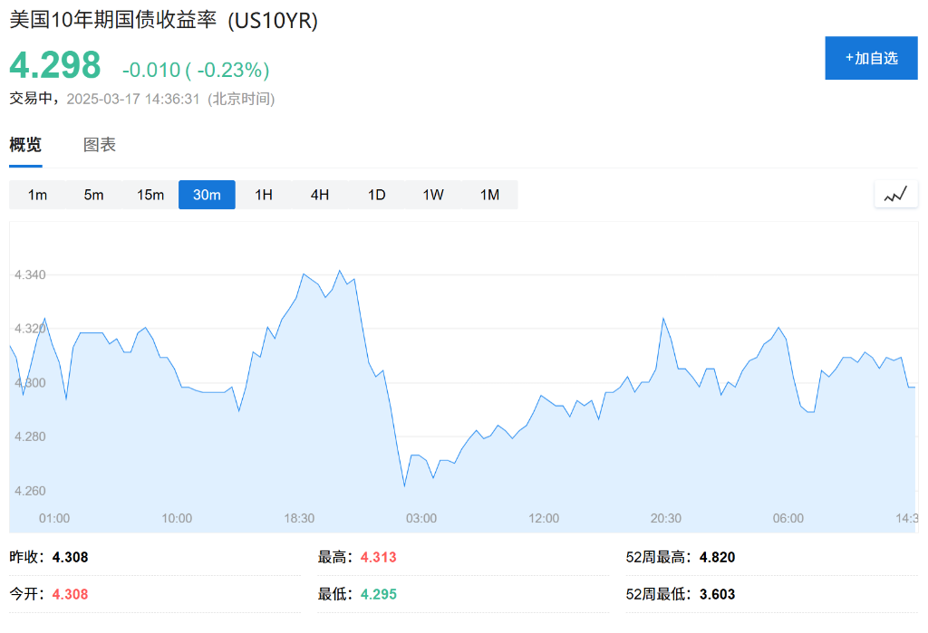 美国国债小幅上涨,基准10年期国债收益率下跌1个基点至4.30%。