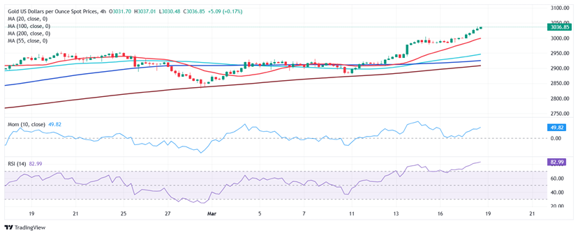 24K99讯 周三(3月19日)亚市盘中,现货黄金维持日内升势,金价刚刚触及3039.04美元/盎司,创下历史新高。FXStreet首席分析师Valeria Bednarik撰文,对黄金技术前景进行分析。