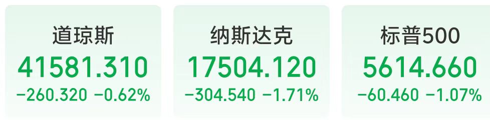 当地时间3月18日,美股三大股指集体下挫,终结了此前两个交易日的反弹趋势。道指跌0.62%,报41581.31点,标普500指数跌1.07%,报5614.66点,纳指跌1.71%,报17504.12点。