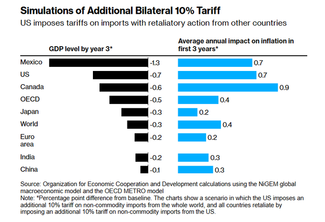 OECD模拟了10%双边关税下各国经济和通胀可能受到的影响