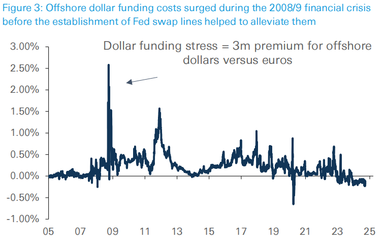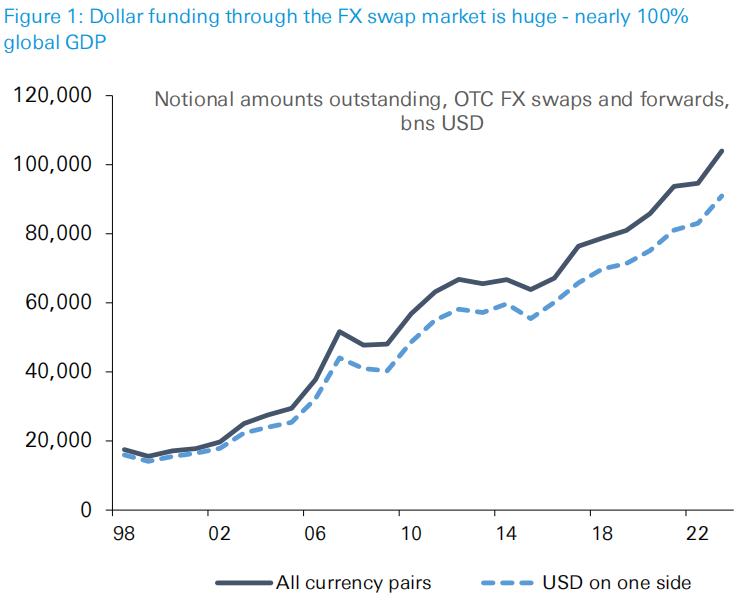 3月27日,瑞银报告中指出,美联储的美元互换额度是维持全球金融稳定的关键工具,远比关税更具影响力。美元互换机制控制着规模约97万亿美元的外汇掉期市场,相当于全球GDP总和。