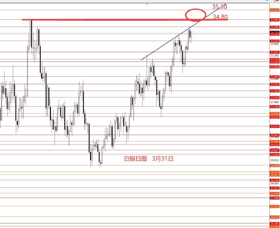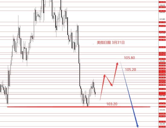 3月31日,美指上周向上反弹,104.60又承压回落,周图收小阴柱。从图形来看,美指修整行情还没完结,四月初继续向上反弹的概率相对较大些,下方重点关注103.40,若能企稳,再进场做多,继续抓向上的反弹行情,上方重点关注105.20和105.80强阻力。今日只有大框架思路,没有具体操作建议。